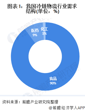 冷链物流行业是我国现代物流行业的重要组成部分。冷链物流行业的需求结构涉及食品、医药和化工等行业。目前,食品冷链需求是我国冷链物流需求的大头,占比行业总需求达90%,其次是医药行业的冷链需求,占比达9%,主要涉及疫苗、血液制品等药物的冷链储存与运输需求。