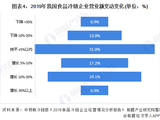 然而,巨大的冷链需求并未给多数冷链物流企业带来同比例的业绩增长。据《2019食品冷链企业经营情况分析报告》中对全国87家冷链企业的调研数据显示,有31%的参与调研企业反馈2019年的营业额几乎与2018年持平,增减幅度在5%以内;24.1%的调研企业表示其营业额增长幅度在10-30%之间;同时,有20.7%的调研企业表示其营业额降幅大于10%。