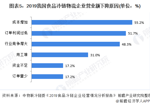 针对营业额有所下降的原因,大部分参与调研的冷链物流企业表示是受“成本增加”因素影响,反馈企业占比达55.2%;其次是“订单利润过低”因素,反馈占比达51.7%。此外,行业竞争加剧、用工难和资金不足等问题也是困扰食品冷链物流企业业绩增长的痛点所在。